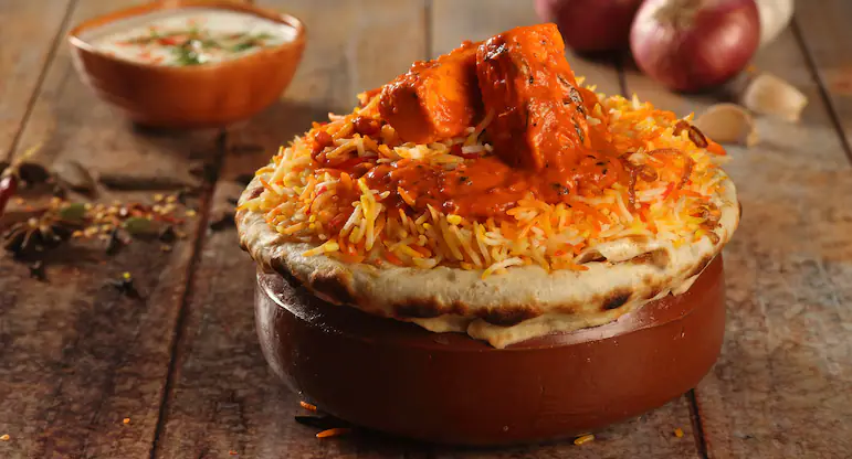 Rs. 450 for 5 people, with 200 gm chicken and 500 gm of cooked rice per person.